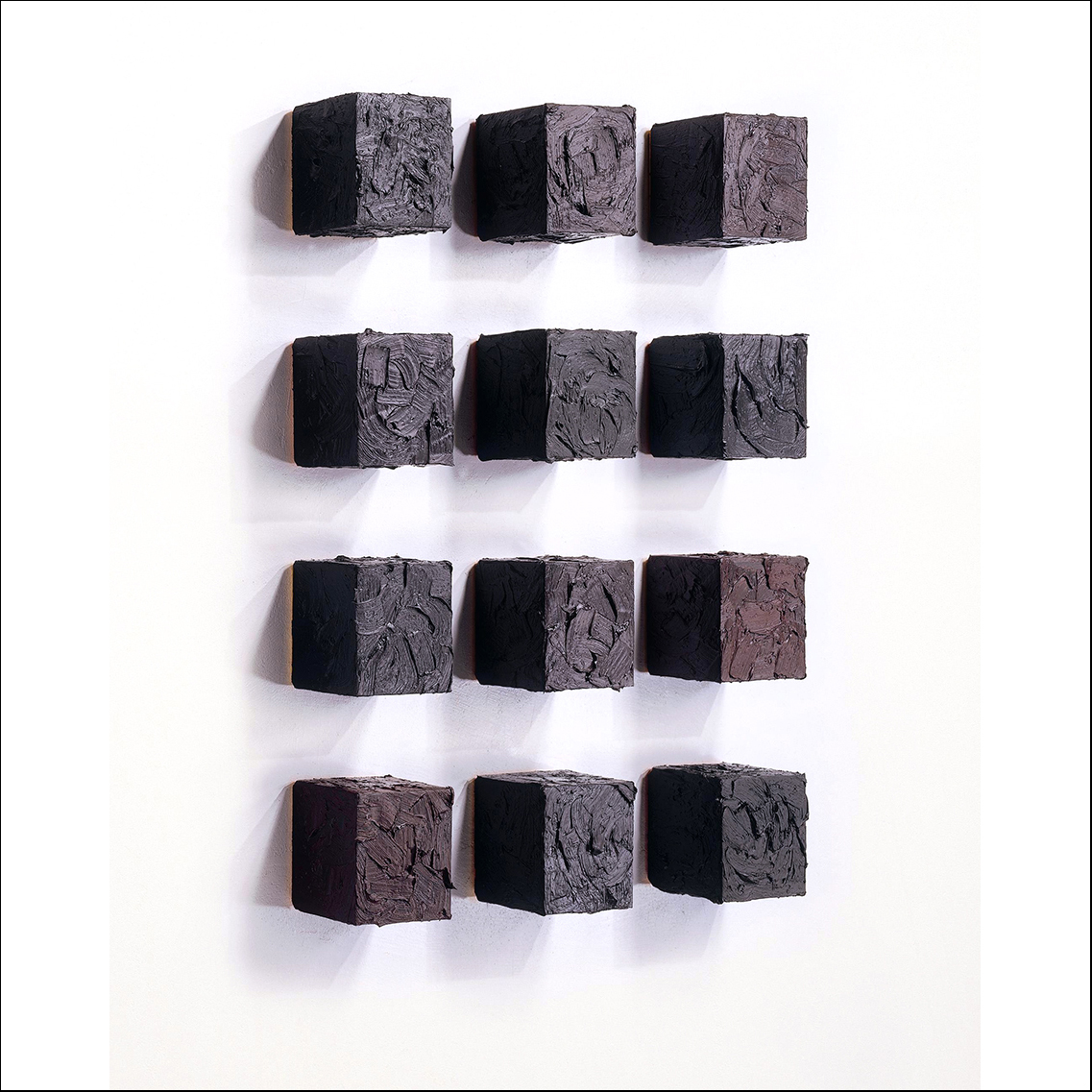 In this series there have been made a total of 100 Boxes. All Boxes are made from several variations black – deep Bordeaux red oil paint on wood.